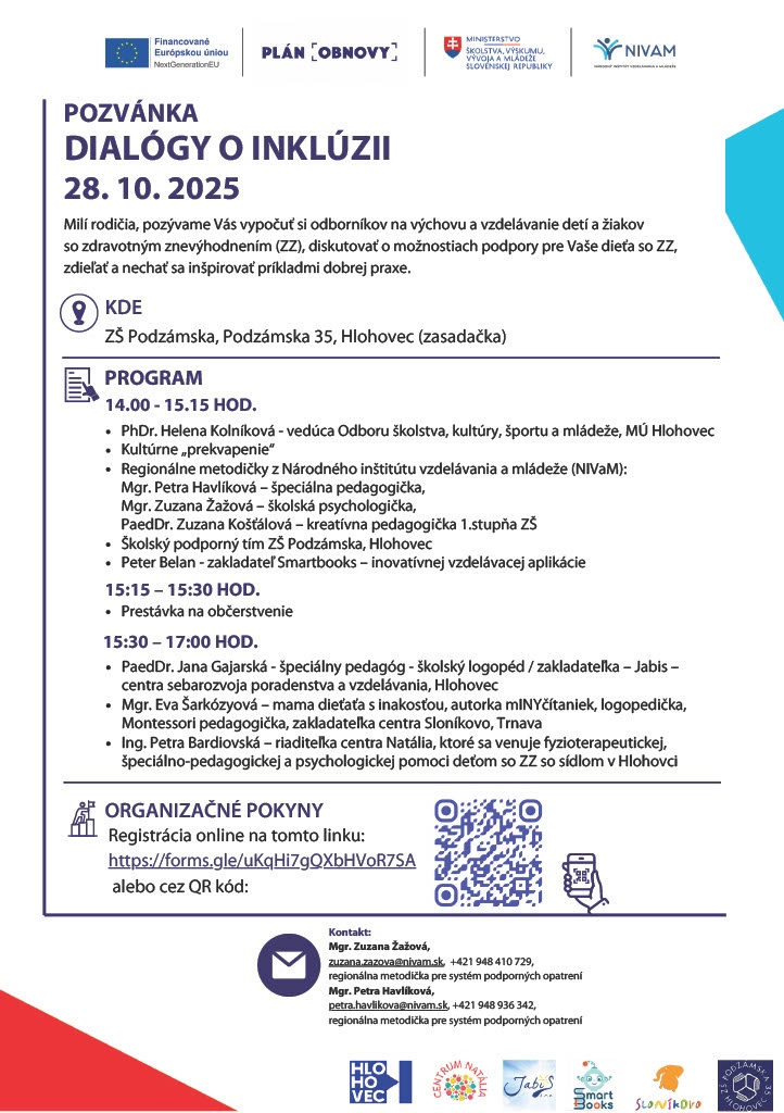krajské pracovisko NIVAM Trnava Vás pozýva na podujatie s názvom „Dialóg o inklúzii“, ktorým sa bude snažiť naplniť obsah motta „ Svet je krajší, keď v ňom má miesto každý“.